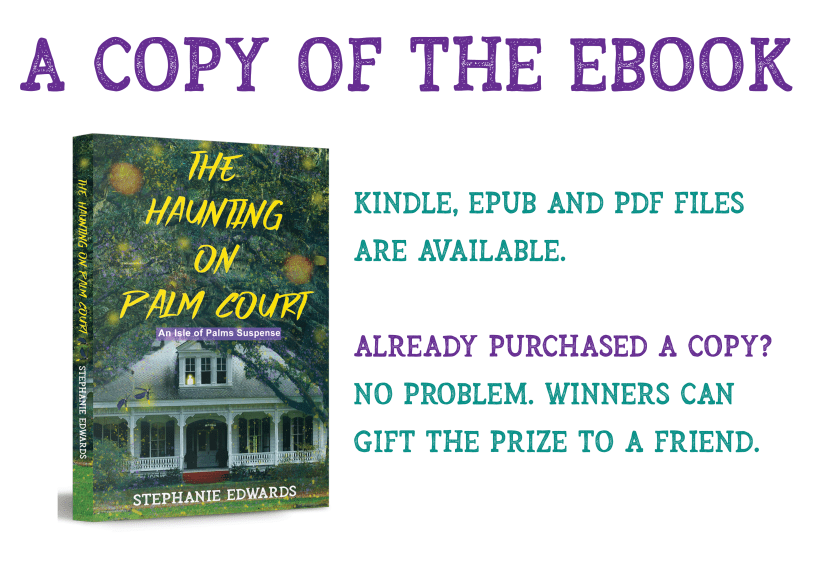 The video had to be prerecorded due to a family emergency. Please view the video launch my first novel, The Haunting on Palm Court: An Isle of Palms Suspense on my Facebook author page or YouTube channel. One of my best pals, Lia Ballentine, served as the event host, and the talented Burn the Treaty performed–thanks Morgan and Scott! I shared insights about the book, and you’ll have a chance to ask me questions in the comments section under the video. Last but not least, we’re going to give away some awesome door prizes! During the video, we shared key words. Anyone who chooses the option with all of the words here will be entered into a drawing to win the Grand Prize. Those who select another option will still be entered into a drawing for the other four prizes. All entries must be placed by 11 p.m. on Sept. 2. See the prizes below.